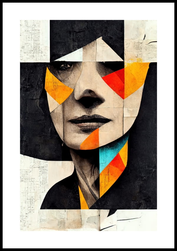 Odważny, graficzny portret przedstawiający twarz z kolorowymi, geometrycznymi akcentami. Grafika sprawdzi się w pomieszczeniach urządzonych nowocześnie.
