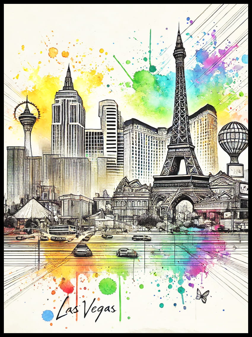 Ten dynamiczny i pełen energii obraz przedstawia pulsujące światłami miasto grzechu, ukazując jego najbardziej ikoniczne zabytki i neonowe reklamy.