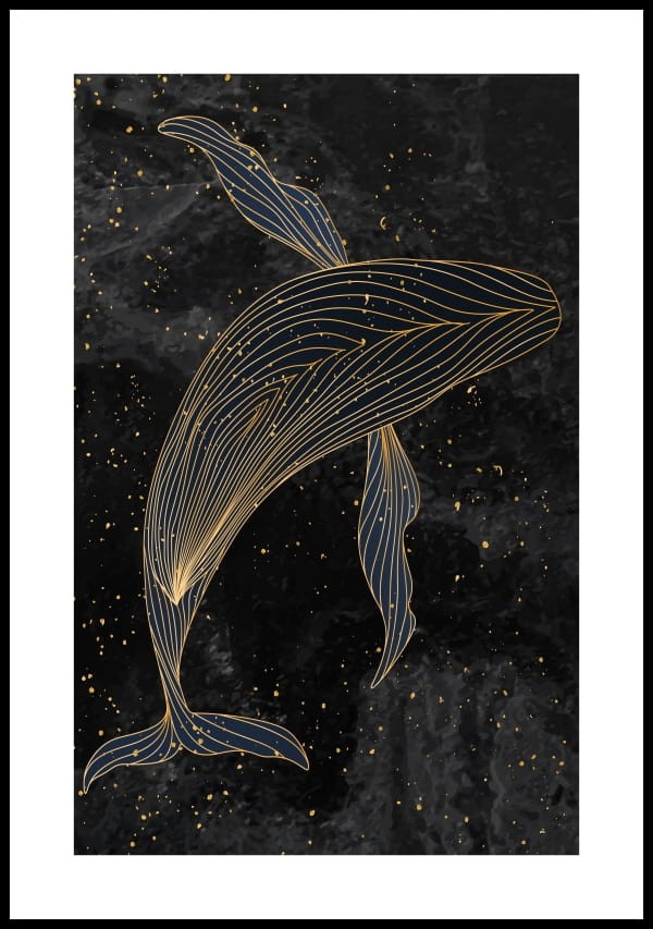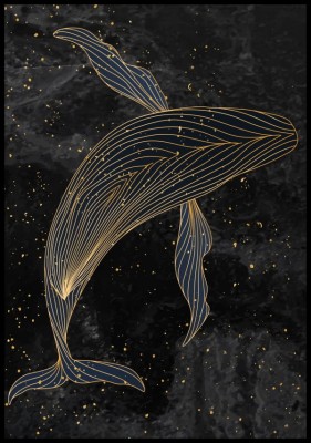 Przepiękny graficzny plakat przedstawiający wieloryba na tle przypominającym rozgwieżdżone niebo.