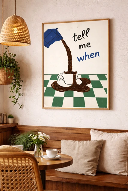 Oryginalny i pełen charakteru plakat „Tell me when” to idealna dekoracja dla miłośników kawy i stylowych wnętrz. Ilustracja przedstawiająca przelewającą się kawę w połączeniu z minimalistycznym napisem tworzy nowoczesną, lekko humorystyczną kompozycję, która przyciąga uwagę i nadaje przestrzeni wyjątkowego klimatu.