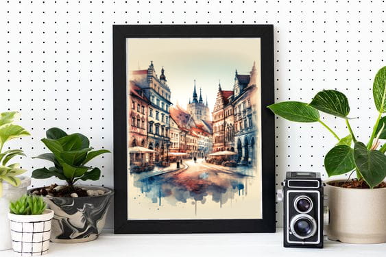 Odkryj magię Torunia, uchwyconą w delikatnych pociągnięciach pędzla i zachwycających odcieniach akwareli. Ten wyjątkowy plakat przenosi nas w sam serce jednego z najbardziej urokliwych miast Polski, znanego z bogatej historii i zjawiskowej architektury.