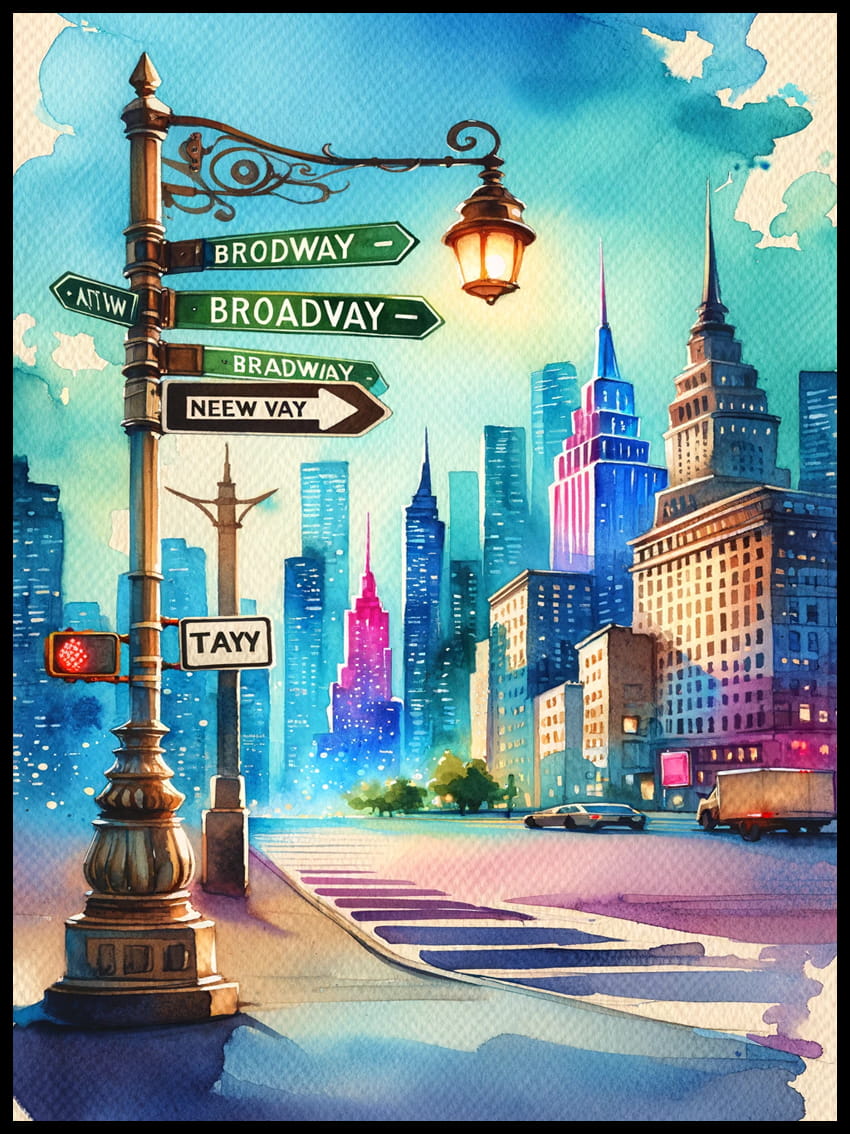 Plakat, USA - Drogowskaz Broadway - akwarela