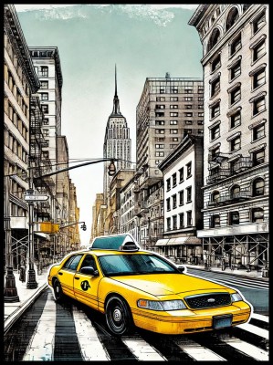Ten plakat przenosi Cię prosto na tętniące życiem ulice Nowego Jorku, gdzie charakterystyczne żółte taksówki suną wśród strzelistych wieżowców.