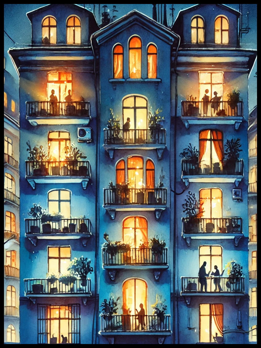 Ciepłe światła rozświetlające okna i subtelne akwarelowe detale tworzą atmosferę intymności i nostalgii, idealnie oddając magię miejskiego życia.