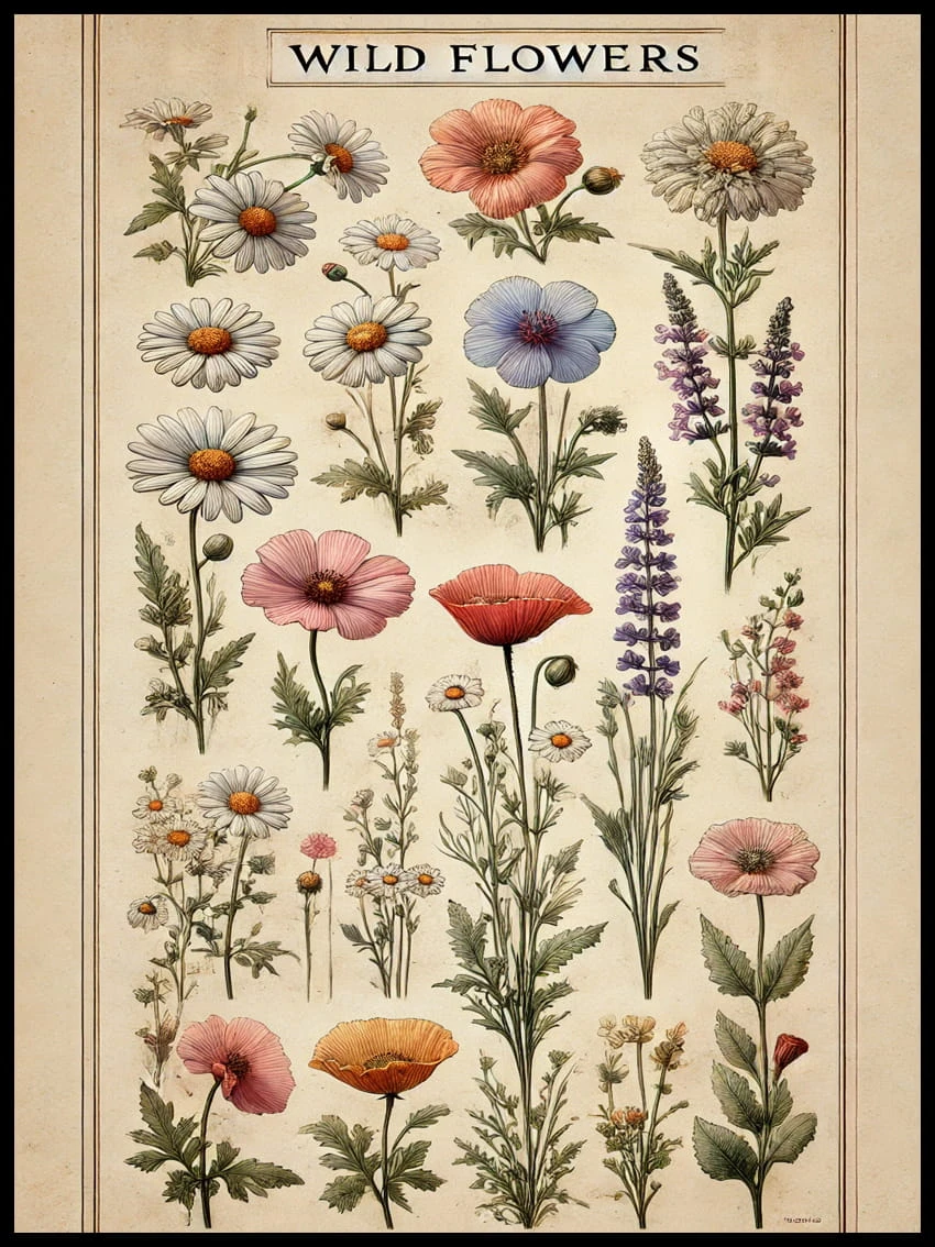 Plakat "Vintage Wild Flowers" to esencja naturalnej elegancji z nutą nostalgii. Pięknie odwzorowane dzikie kwiaty, w delikatnych odcieniach, przenoszą w czasy, gdy natura była najbliżej człowieka.