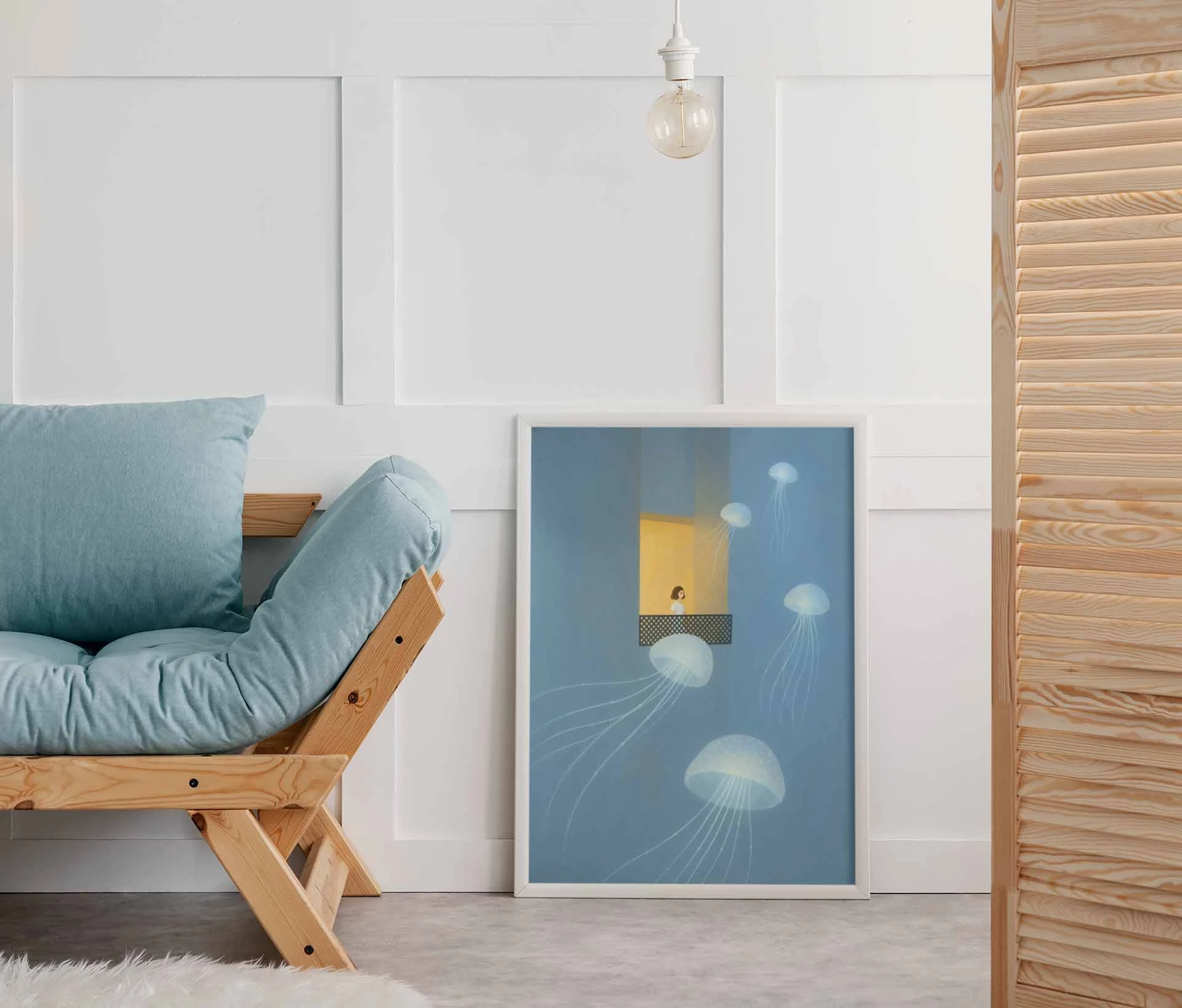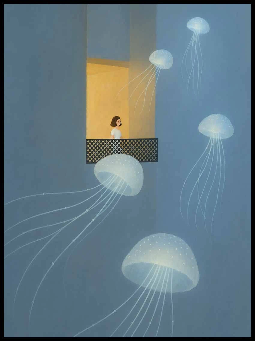 Delikatny, poetycki obraz, który przenosi nas w świat marzeń. Plakat „W morskim świecie” przedstawia dziewczynkę stojącą na balkonie, otuloną ciepłym światłem z wnętrza mieszkania, a wokół niej unoszą się świetliste meduzy, jakby płynęły przez niebo zamiast przez wodę. Ta niecodzienna scena łączy domowe ciepło z magicznym światem wyobraźni.