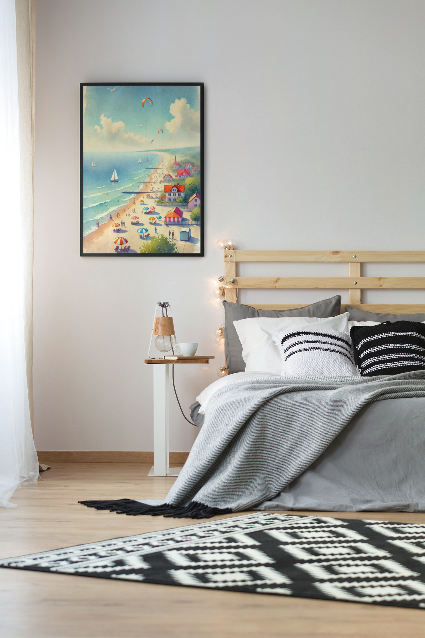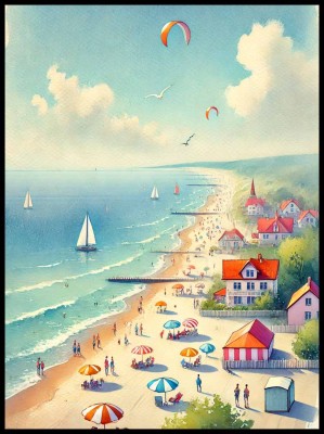 Plakat „Wakacje nad morzem” ukazuje urok tego wyjątkowego miejsca – od szerokich plaż i nadmorskich wydm po charakterystyczną latarnię morską i otulające miasto fale Bałtyku.
