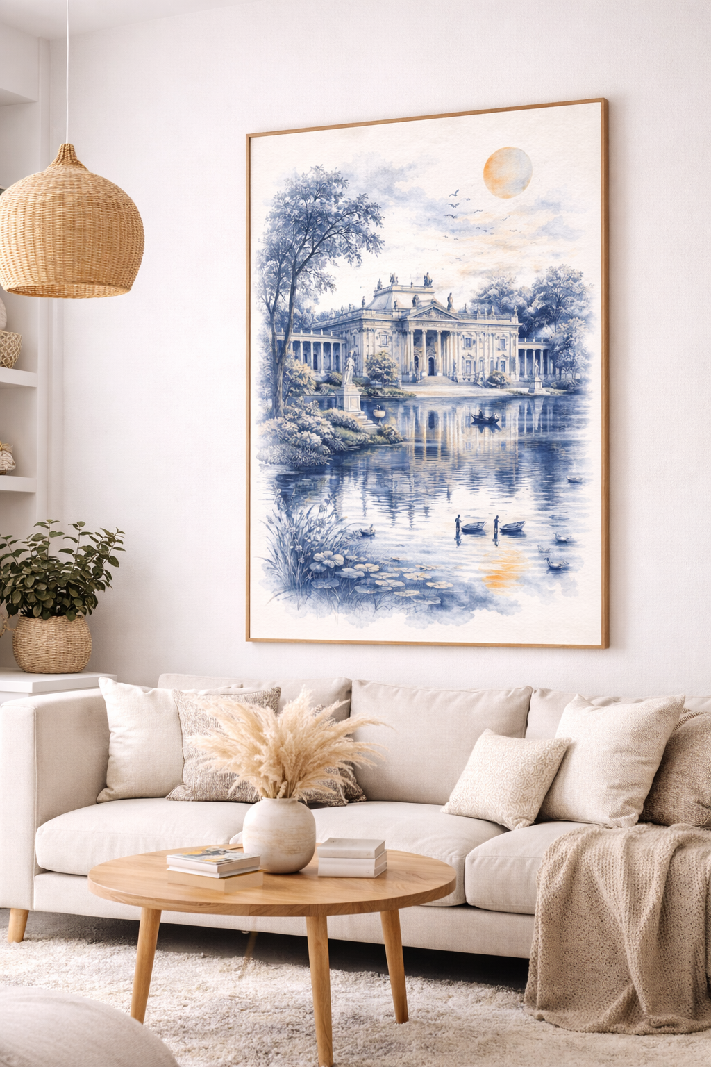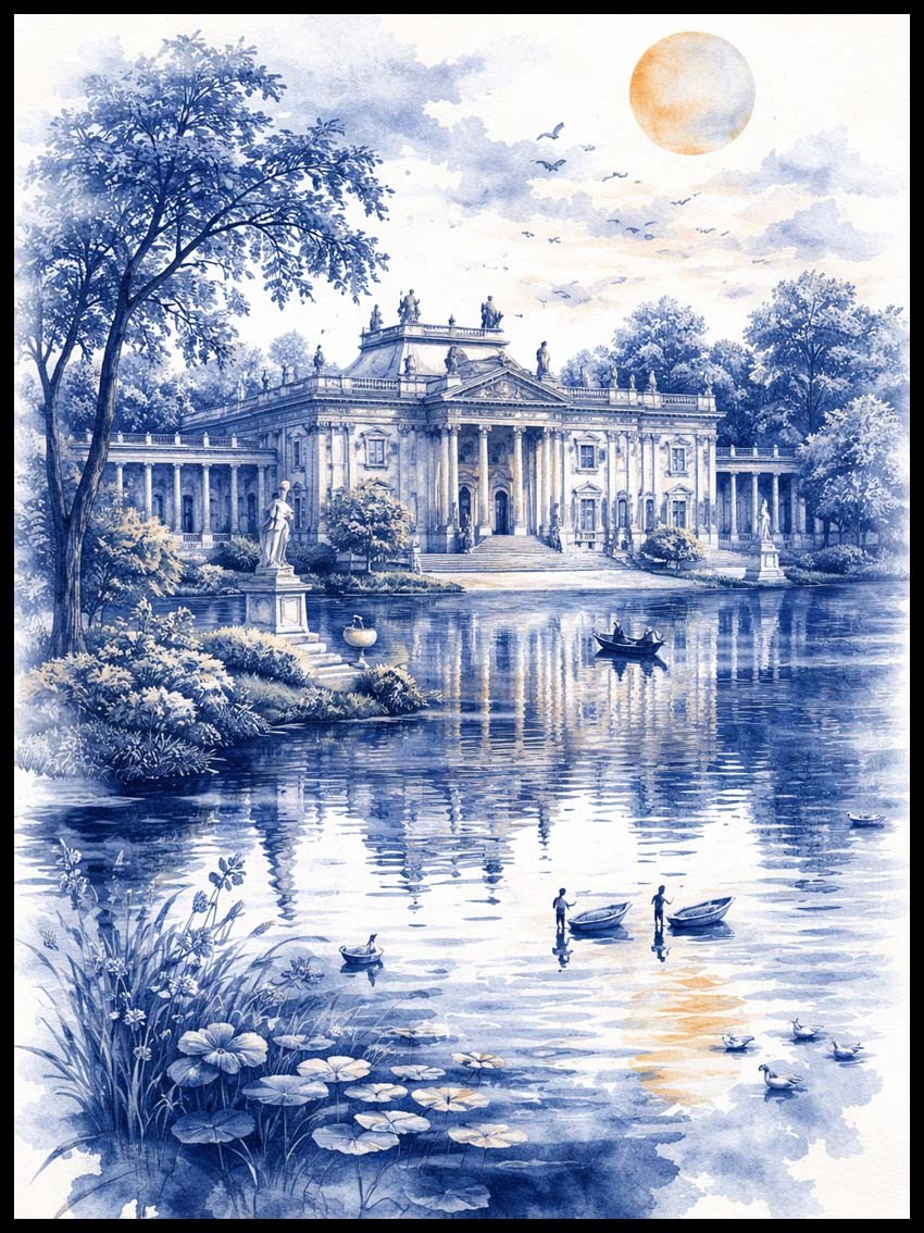 Plakat "Łazienki Królewskie – Oaza Spokoju w Sercu Warszawy" to elegancka kompozycja oddająca piękno jednego z najbardziej ikonicznych miejsc stolicy. Łazienki Królewskie – pełne bujnej zieleni, romantycznych stawów i wytwornych pałaców – to miejsce, w którym historia spotyka się z naturą.