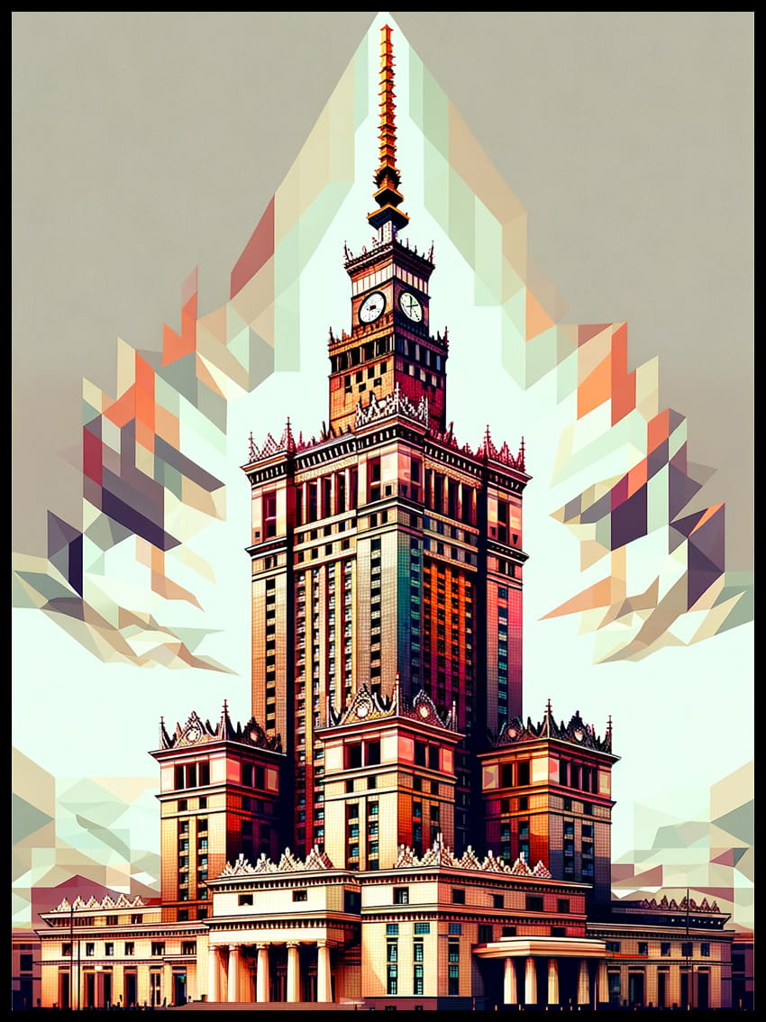 Na plakacie Pałac Kultury i Nauki został przedstawiony z niezwykłą dbałością o detale, gdzie każda linia i każdy kontur zostały precyzyjnie zaprojektowane, aby oddać charakterystyczną sylwetkę i architektoniczne detale budowli.