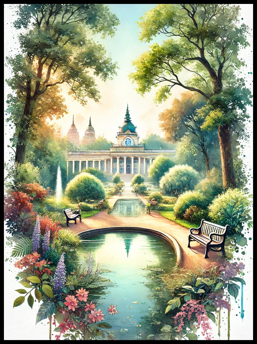 Plakat "Łazienki Królewskie – Oaza Spokoju w Sercu Warszawy" to elegancka kompozycja oddająca piękno jednego z najbardziej ikonicznych miejsc stolicy. Łazienki Królewskie – pełne bujnej zieleni, romantycznych stawów i wytwornych pałaców – to miejsce, w którym historia spotyka się z naturą.
