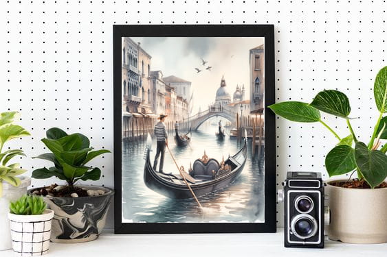 Na tym wyjątkowym plakacie Wenecja gondolier odsłania swoje tajemnice w delikatnych odcieniach akwareli, które łączą się, by uchwycić ulotność chwil i subtelność emocji, jakie budzi to miejsce.