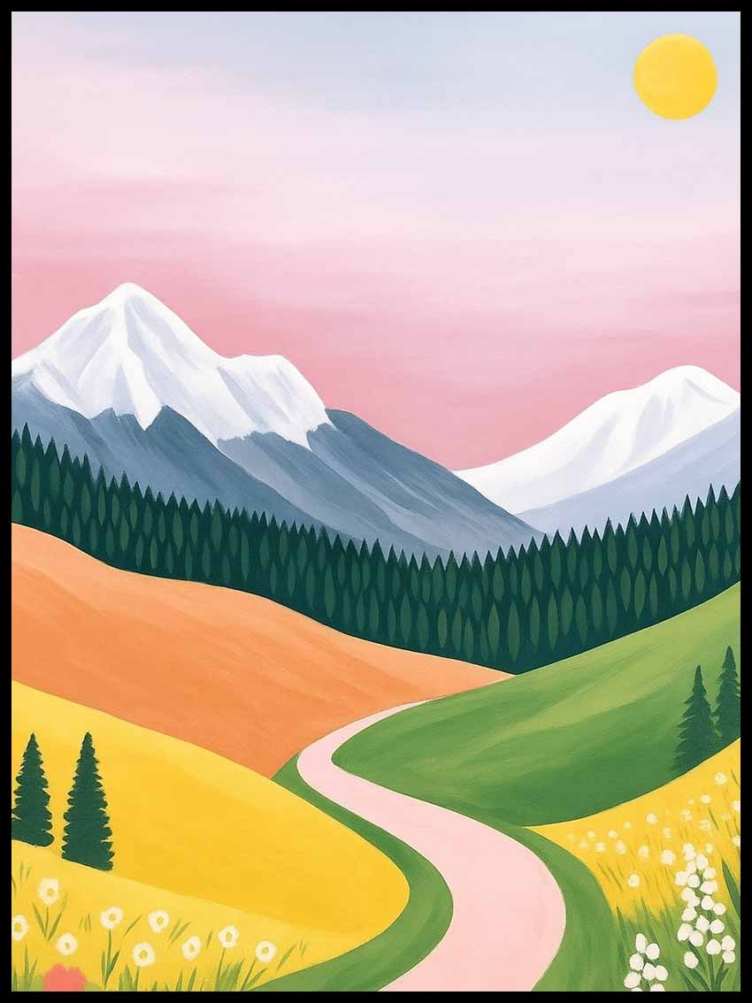 Przenieś magię gór do swojego wnętrza dzięki wyjątkowemu plakatowi przedstawiającemu majestatyczne szczyty wznoszące się nad malowniczym krajobrazem.