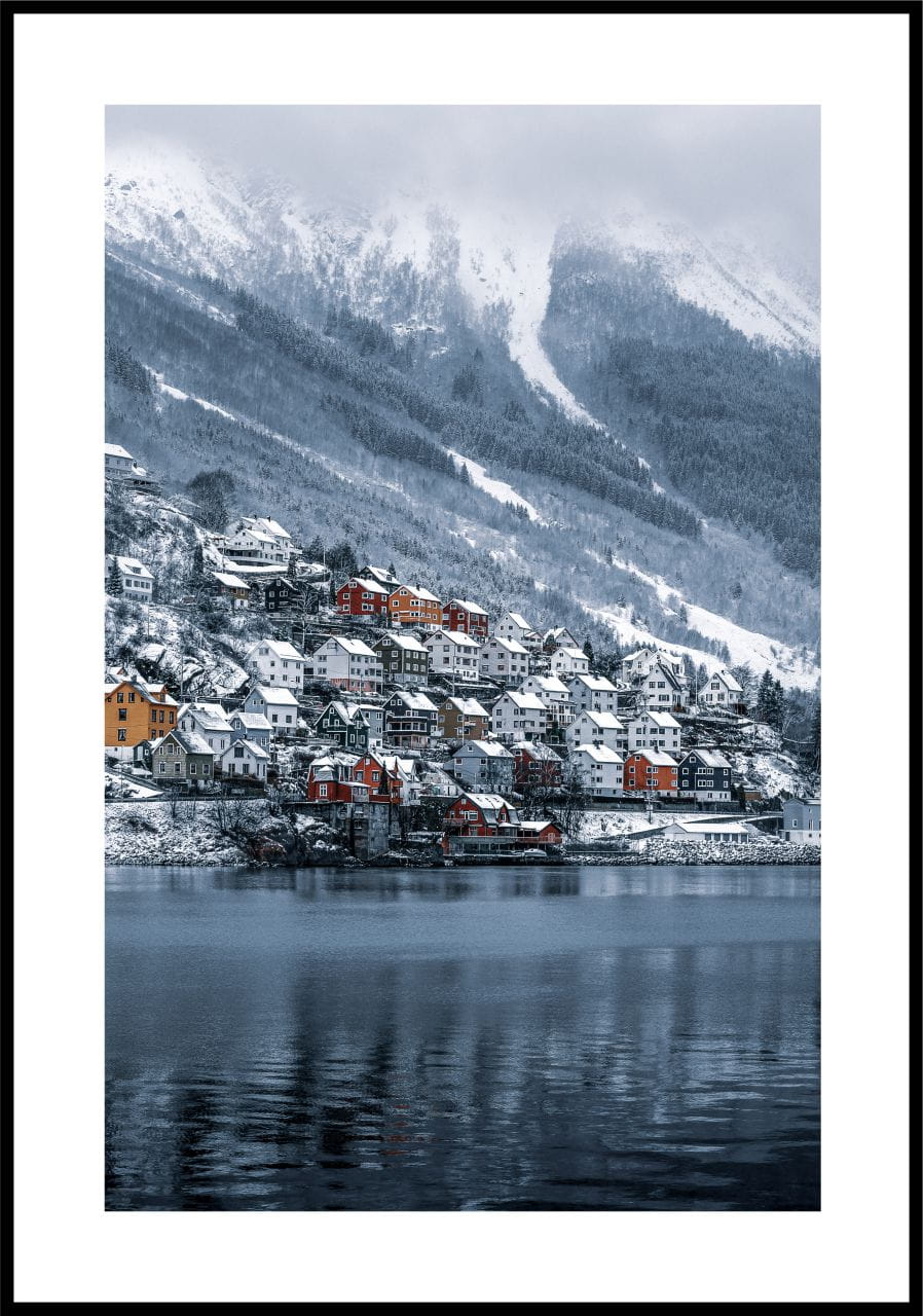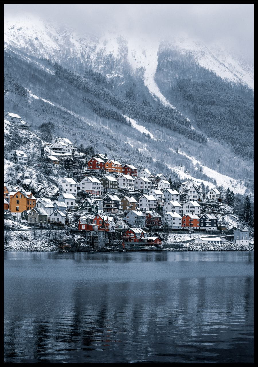 Czerwone norweskie domy na brzegu. Do plakatu norweskie domy mamy kilka idealnie pasujących propozycji.