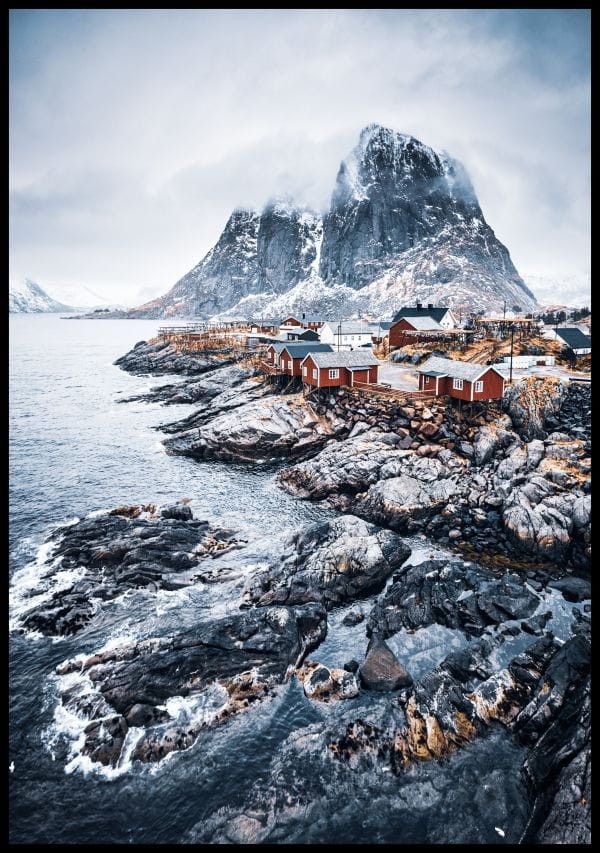 Klimatyczny plakat krajobrazowy pokazujący wioskę rybacką Hamnoy.