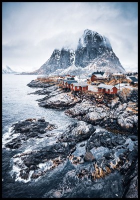 Czerwone norweskie domy na brzegu. Do plakatu norweskie domy mamy kilka idealnie pasujących propocyzji.