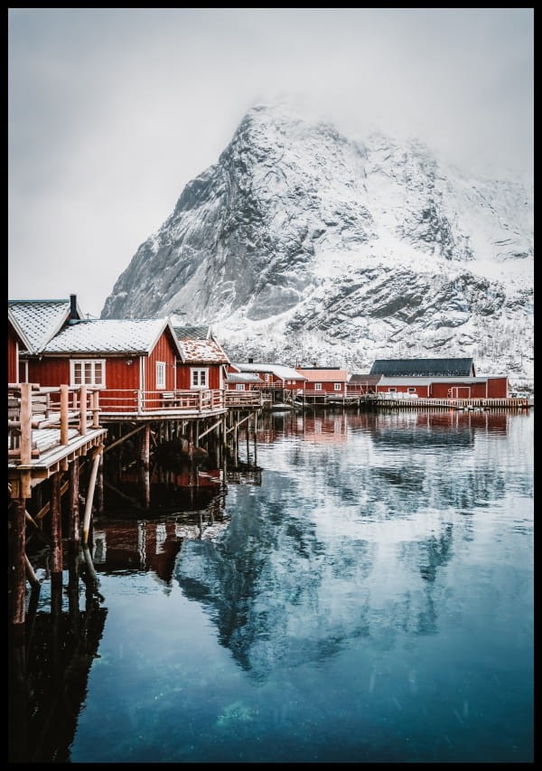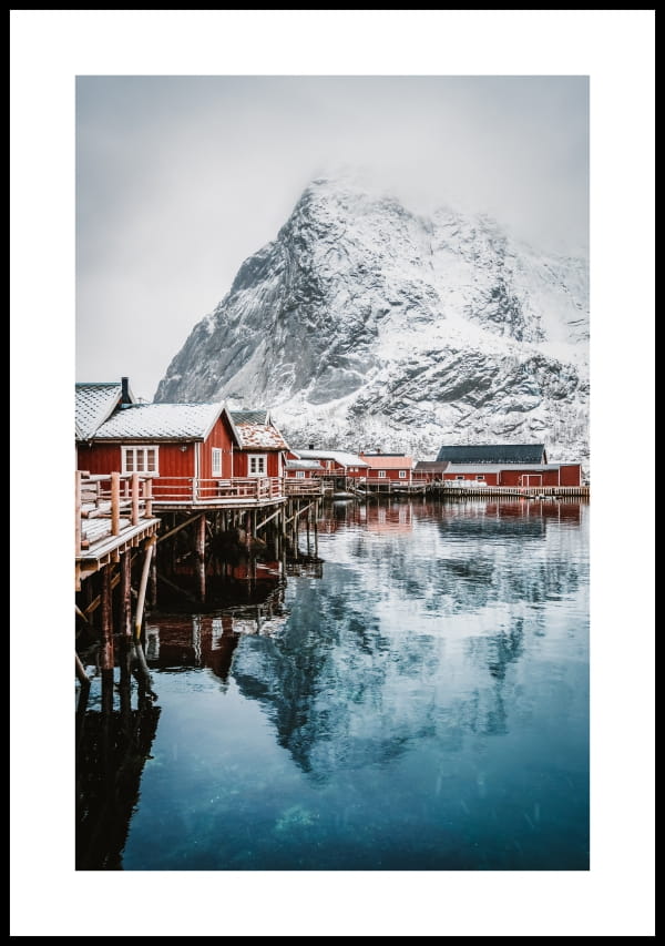 Czerwone norweskie domy na brzegu. Do plakatu norweskie domy mamy kilka idealnie pasujących propozycji.