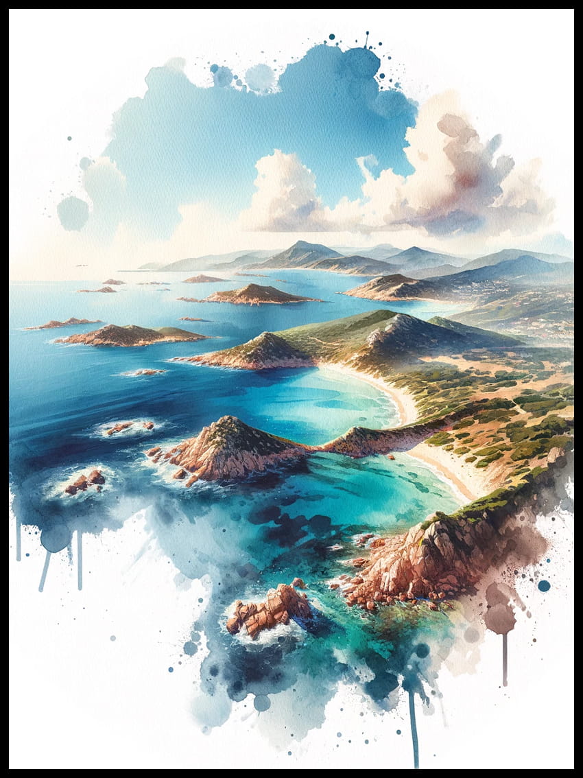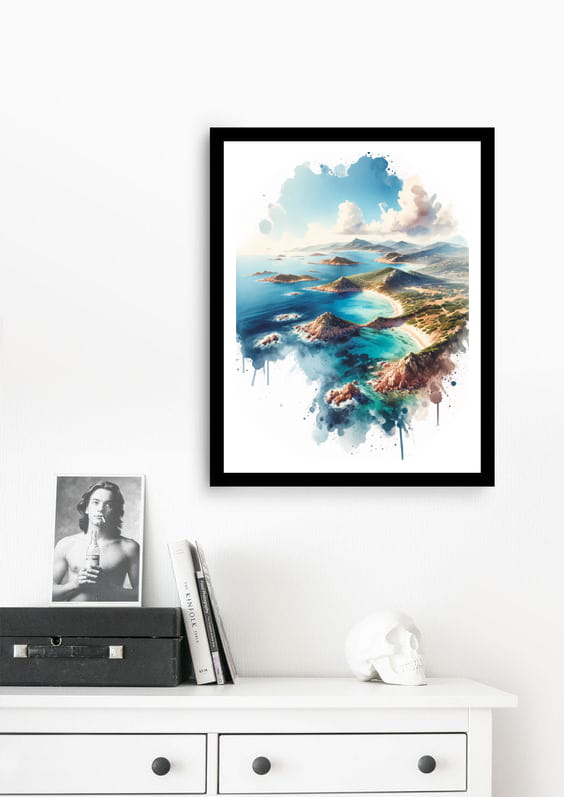 Odkryj Sardynię na nowo dzięki temu wyjątkowemu plakatowi! Nasza akwarelowa interpretacja uchwyciła esencję tej urokliwej wyspy, przenosząc jej kolorowy krajobraz, bogactwo kultury i ciepło słońca prosto na ściany Twojego domu.