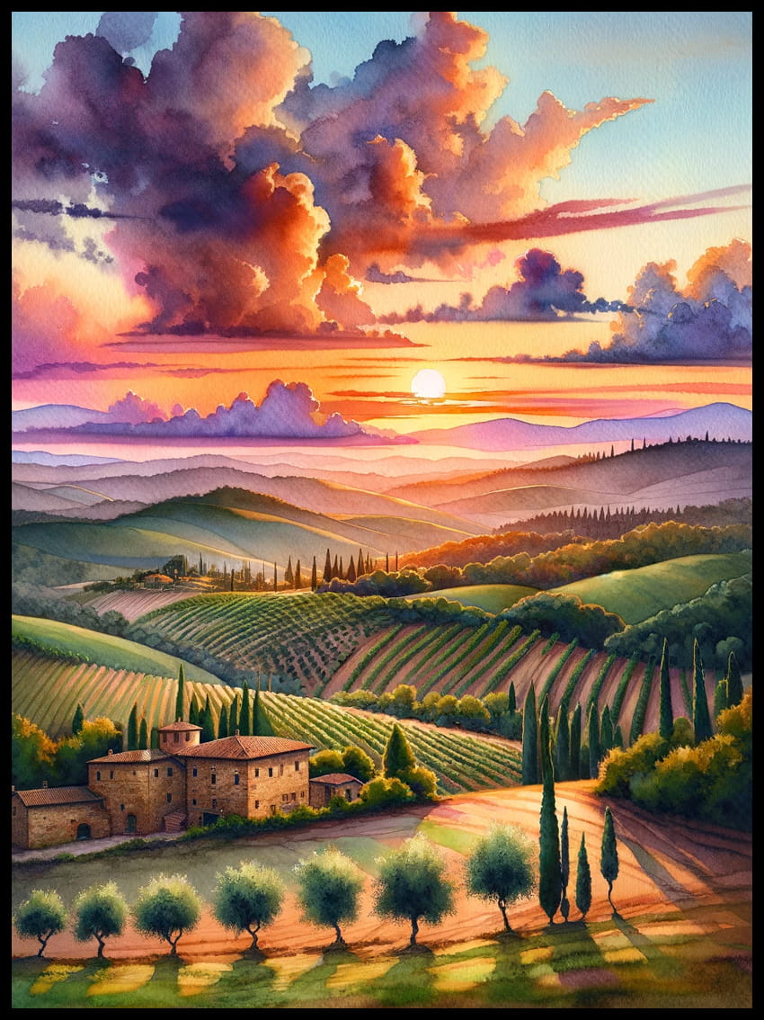 Plakat, Włochy Toskania Zachód słońca - akwarela