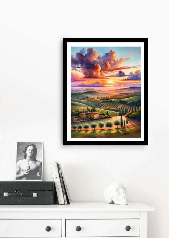 Poczuj ciepło włoskiego słońca każdego dnia z naszym plakatem "Italian Sunset". Zapraszamy Cię do świata, gdzie słońce tonie w ciepłych barwach nad malowniczymi krajobrazami Włoch, a każdy kadr opowiada historię wieczornego spokoju i niezakłóconej harmonii.