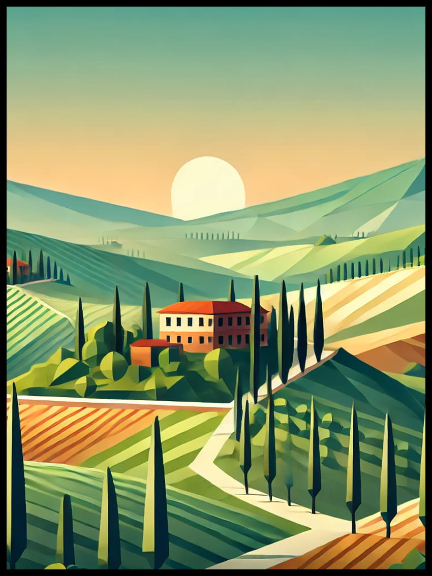 Rozległe wzgórza, pola pełne słoneczników i cyprysy na horyzoncie tworzą kompozycję, która emanuje spokojem i ciepłem południowego słońca. Stonowane, naturalne barwy oraz subtelne detale przywodzą na myśl sielskie poranki w sercu Italii.