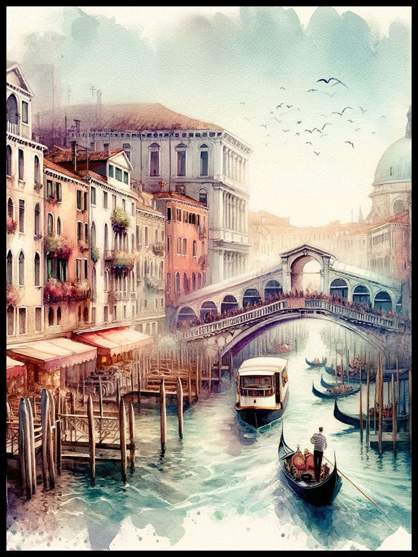 Na tym wyjątkowym plakacie Wenecja odsłania swoje tajemnice w delikatnych odcieniach akwareli, które łączą się, by uchwycić ulotność chwil i subtelność emocji, jakie budzi to miejsce.
