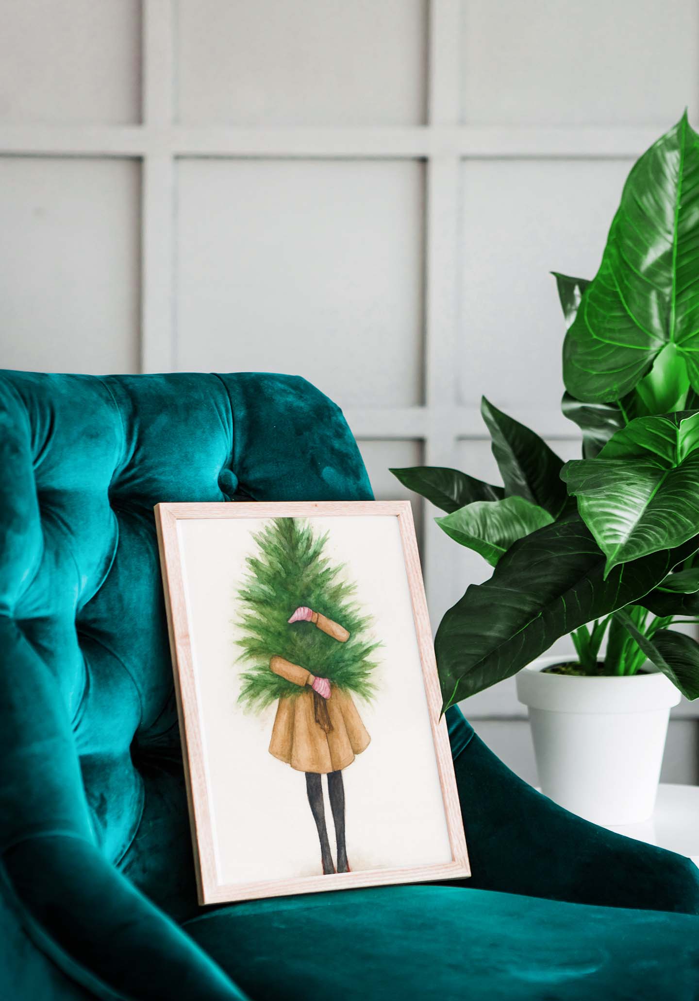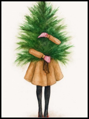 Plakat „Dziewczyna z choinką” – świąteczna grafika akwarelowa | 4rooms.com.pl