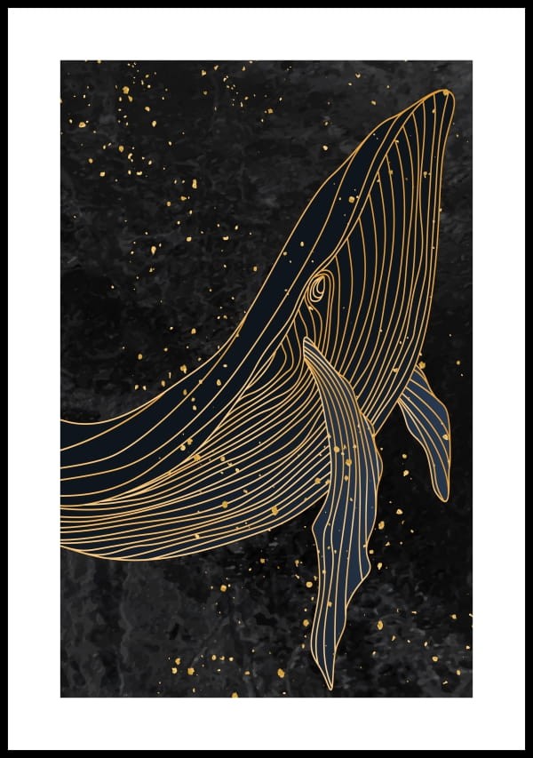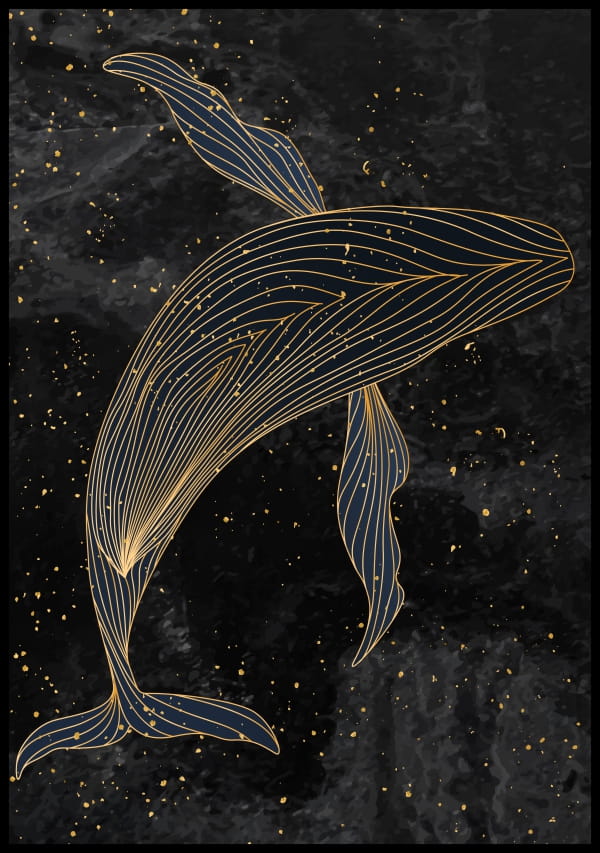 Czarny plakat z wielkim żółtym wielorybem na tle gwiazd.