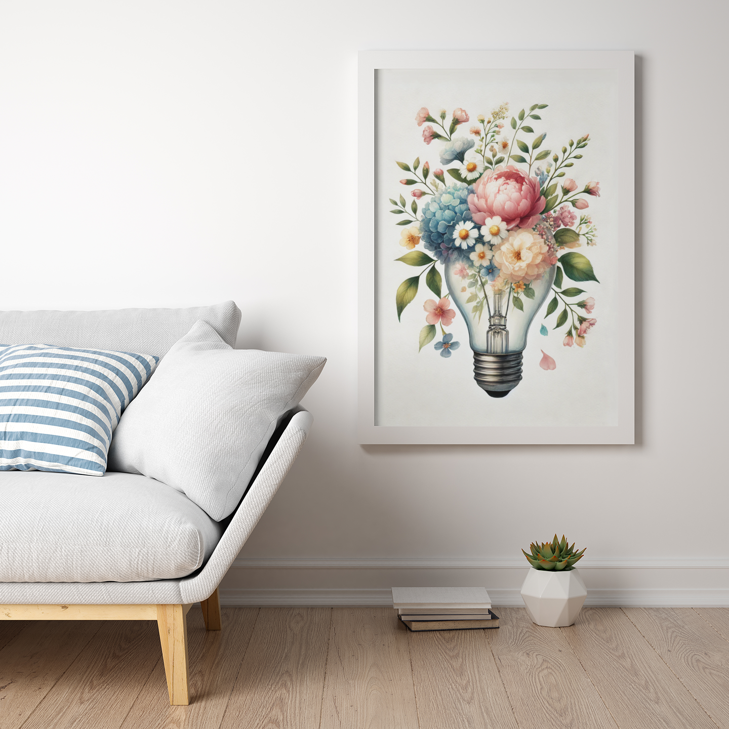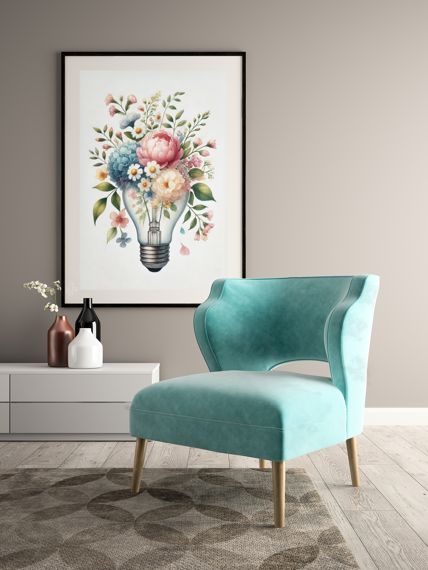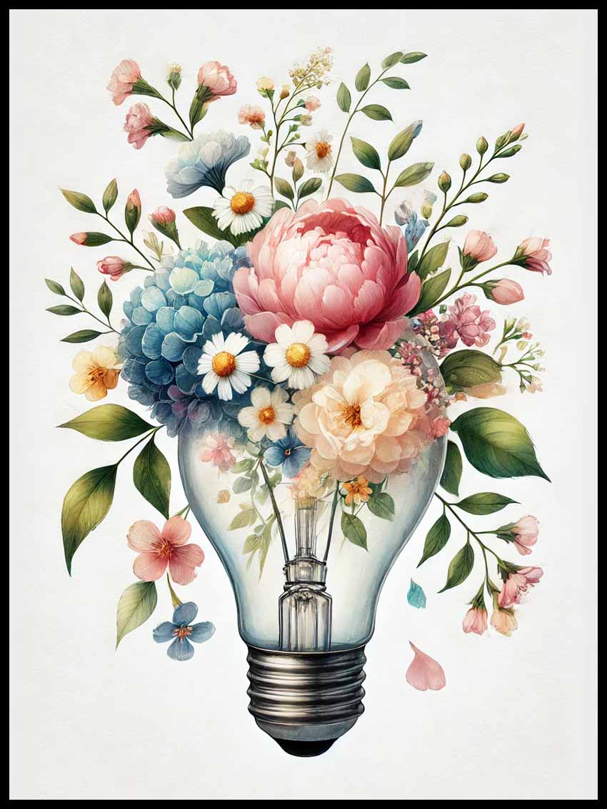Plakat „Żarówka w kwiatach” to symbol kreatywności, życia i energii zamkniętej w delikatnej formie. Połączenie klasycznego motywu żarówki – ikony pomysłów – z kwiatową kompozycją tworzy niezwykłą, inspirującą historię o sile wyobraźni i pięknie natury.
