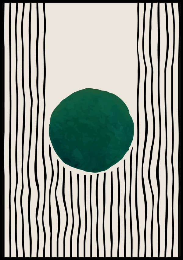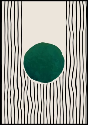 Graficzny plakat z ciemnozieloną kulą i równoległymi, nieregularnymi liniami. Koło jest w kolorze wiec fajnie odbija od linii.