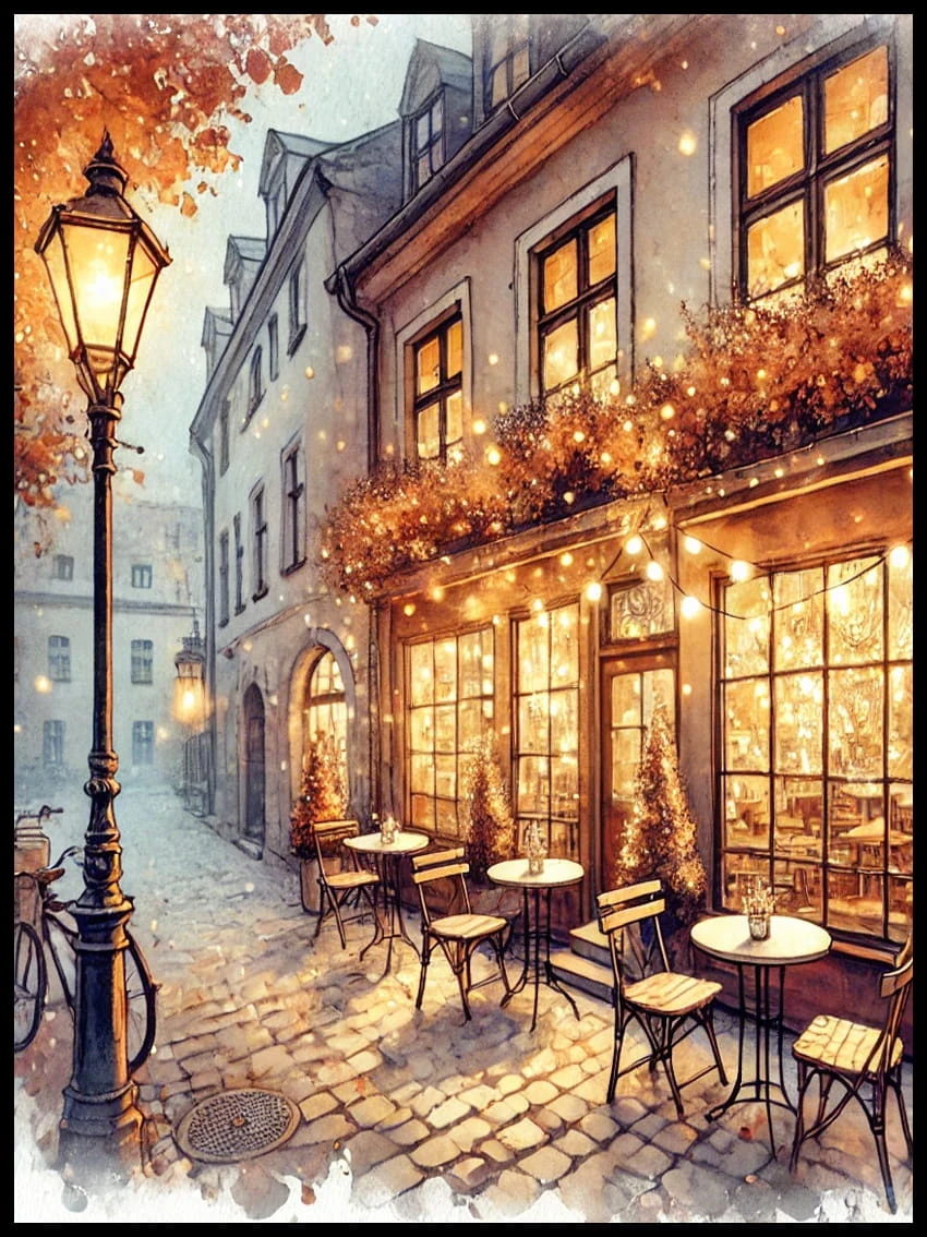 Przenieś się do uroczego miasta skąpanego w świątecznej zimowej aurze dzięki plakatowi „Zimowa Magia Miasta” zaprojektowanemu techniką akwareli. Delikatne pociągnięcia pędzla oddają urokliwe uliczki, migoczące świąteczne dekoracje i biały puch otulający dachy budynków.