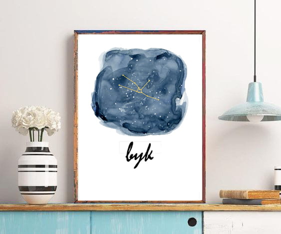 Nowoczesny plakat na ścianę w formie grafiki zaprojektowanej akwarelą Znak zodiaku - Byk. To fajny pomysł na personalizację Twojego pomieszczenia.