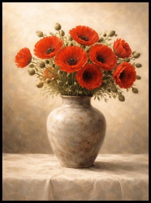 Wprowadź do swojego wnętrza wyjątkowy klimat dzięki eleganckiemu plakatowi przedstawiającemu bukiet czerwonych maków w stylowym, ceramicznym wazonie.