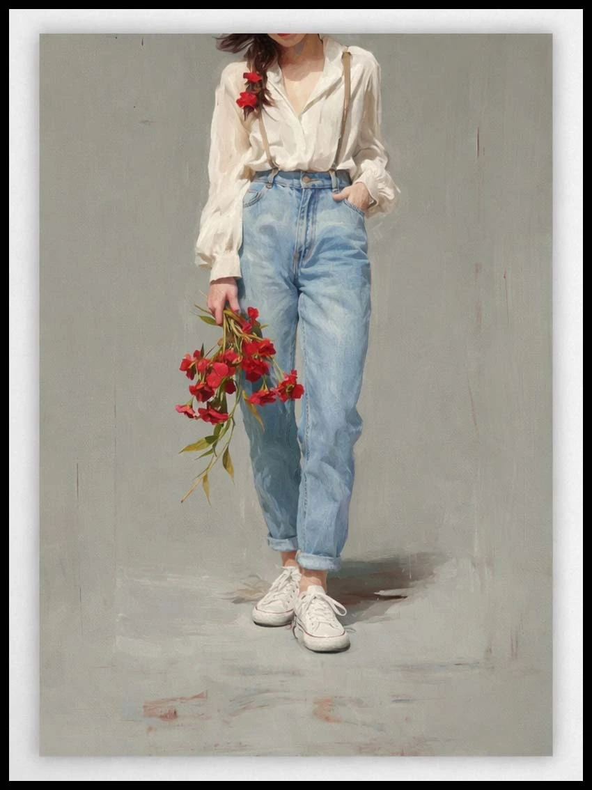 Odkryj wyjątkowy klimat naturalnego piękna dzięki plakatowi przedstawiającemu kobietę trzymającą bukiet intensywnie czerwonych maków.