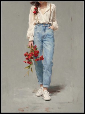 Czerwone maki tworzą wyrazisty kontrast z delikatnym tłem i ubraniem, przyciągając wzrok i nadając wnętrzu charakteru.