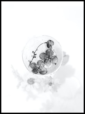 Monochromatyczny plakat z czterolistną koniczyną. Z jednej strony delikatny, z drugiej mroczny.