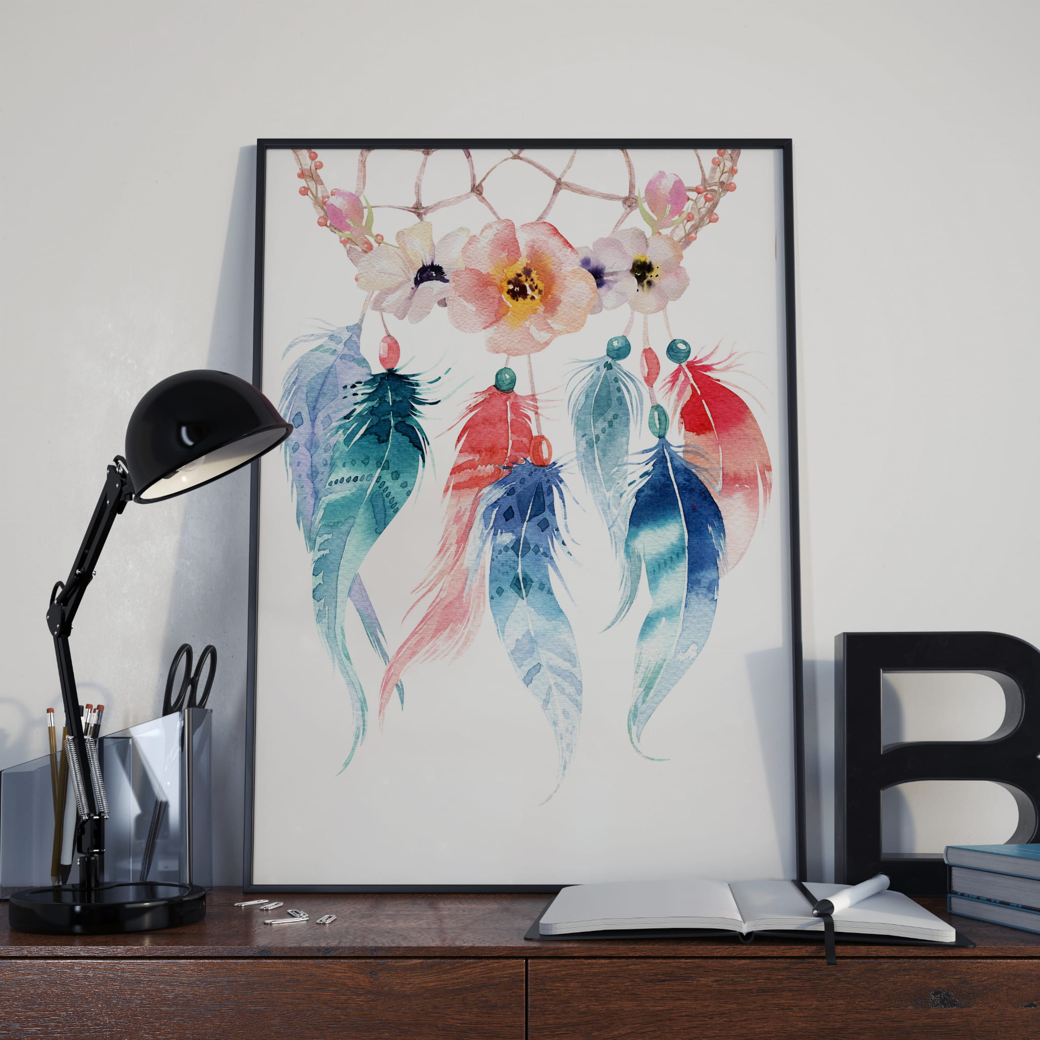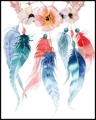 Łapacz snów / Dream catcher - jest to amulet niektórych plemion Indian z Ameryki. Pojawiła się moda na wieszanie łapaczy snów, które mają przynosić szczęście. Często wiszą w pokojach dziecięcych lub na lusterkach samochodów. Plakat to świetna alternatywa do wiszącego łapacza. Piękna nowoczesna grafika. Namalowana jako wotercolour, piękny projekt wprowadzający fajną atmosferę w pomieszczeniu. Plakat z łapaczem snów to fajny pomysł na wystrój wnętrza salonu, czy też pokoju dziecięcego.