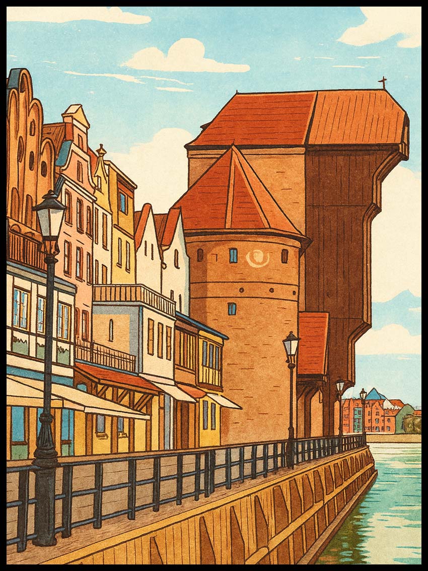 Na plakacie widać piękny widok Żurawia Gdańskiego, który jest wkomponowany w otoczenie malowniczych kamienic i zabytkowych budynków. Wieża żurawia jest przedstawiona w pełnym blasku, podkreślając swoją historyczną i architektoniczną wartość.