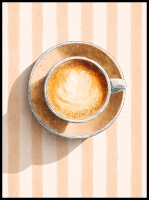 Plakat „Poranna Kawa” to stylowa dekoracja ścienna przedstawiająca filiżankę aromatycznej kawy z delikatnym latte art, uchwyconą z góry w estetycznej, jasnej kompozycji. Ciepłe odcienie beżu i karmelu oraz subtelne tło w pionowe paski nadają grafice elegancki, spokojny charakter.