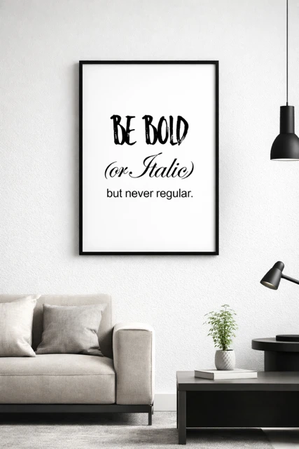 Wyrazisty i stylowy plakat „Be Bold (or Italic) but never regular” to idealna dekoracja dla osób, które lubią oryginalne wnętrza i inspirujące hasła.