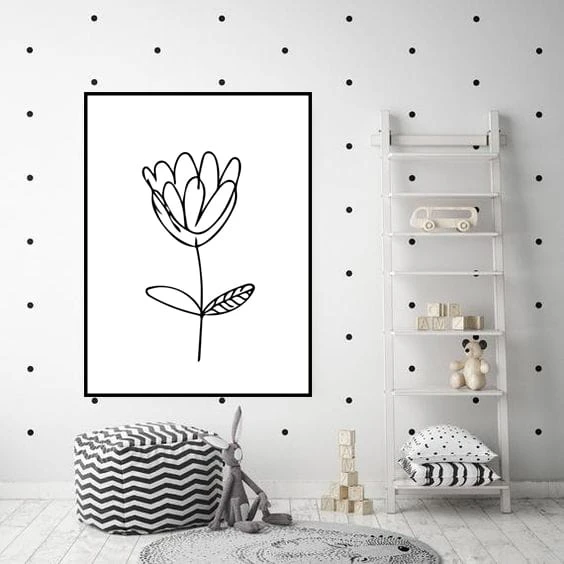 Plakat rysowany kreską Kwiat w stylu Scandi uzupełnia pozostałe produkty z kolekcji Skandynawskiej. Znajdziesz zarówno króliki w różnych kolorach, jak i napisy czy proste grafiki skandynawskie. Prostota to podstawa tego stylu.