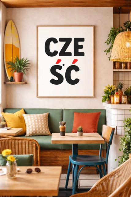 Minimalistyczna forma oraz uniwersalna kolorystyka sprawiają, że plakat pasuje do wnętrz w stylu nowoczesnym, skandynawskim, loftowym oraz minimalistycznym. Hasło „Cześć” dodaje przestrzeni lekkości i naturalności, podkreślając swobodny styl aranżacji.