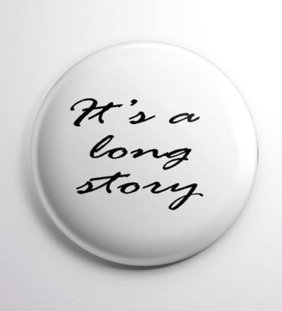 Przypinka z napisem It is a long story