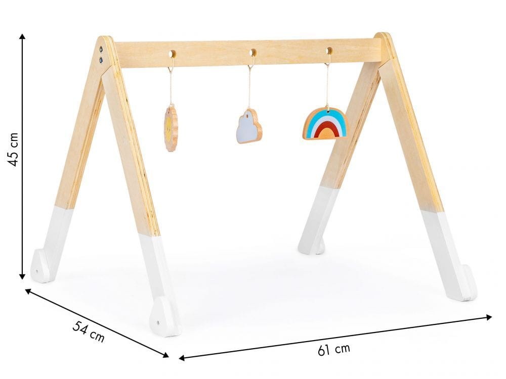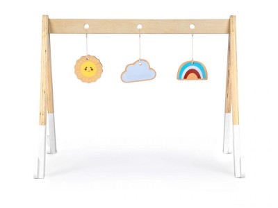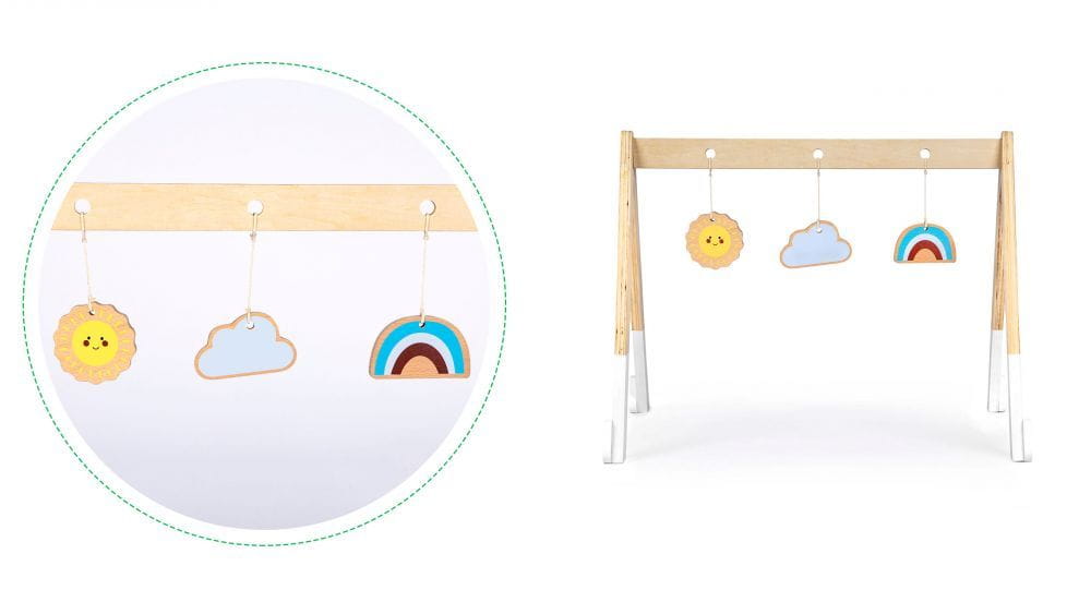 Całość wykonana jest z drewna, na jego poprzeczce zawieszone są 3 kolorowe zabawki. Każda zabawka ma inny kształt i kolory, tak aby Twoje dziecko było odpowiednio stymulowane. Zabawka jest pozbawiona ostrych, niebezpiecznych krawędzi i pokryta farbami bezpiecznymi dla dzieci.
