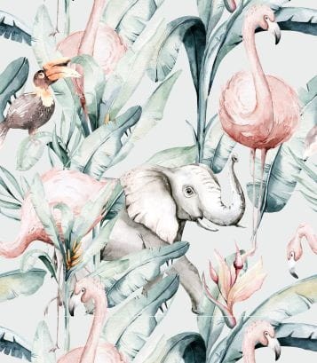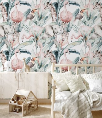 Tapeta "Afrykańskie zwierzęta w dżungli" to bogaty wzór botaniczno-zwierzęcy, który wprowadzi klimat safari w pokoju dziecka.