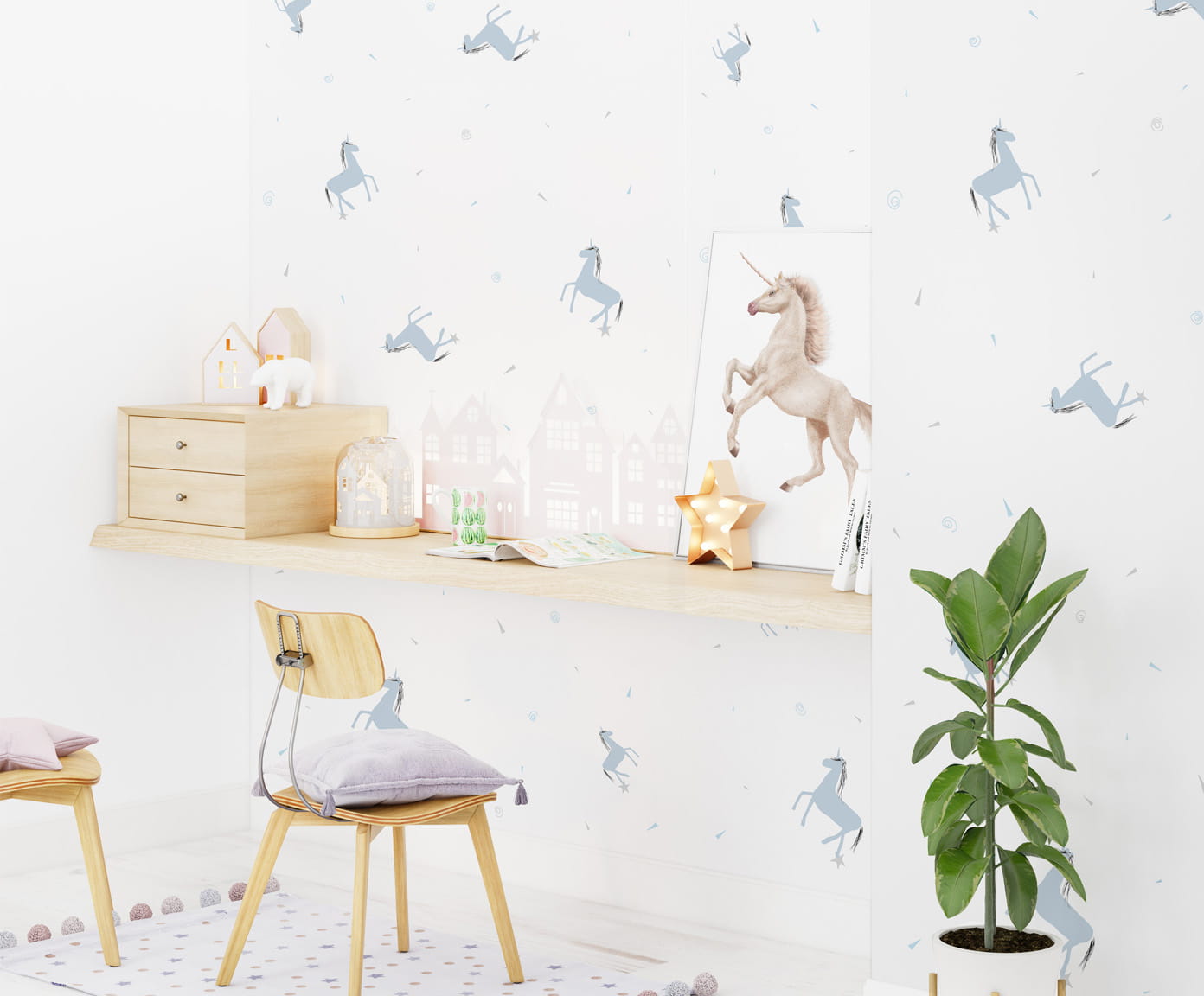 Tapeta dla dzieci Blue Unicorn w delikatnej kolorystyce przeznaczona dla dzieci w każdym wieku.
