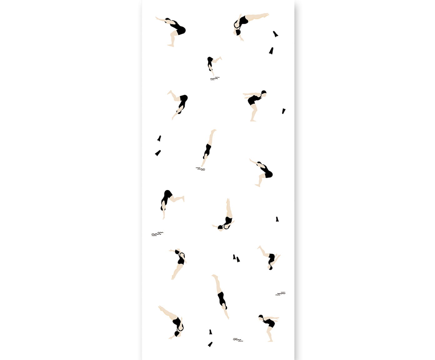 Wzór tworzy układ postaci pływaczek, zachowany w kolorystyce czarno-białej.
