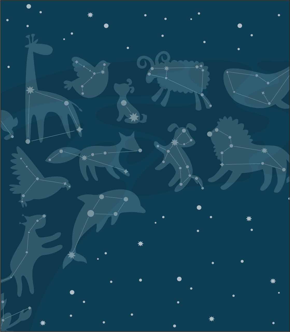 Sympatyczna tapeta przedstawiająca sylwetki zwierząt na tle gwiazdozbioru.