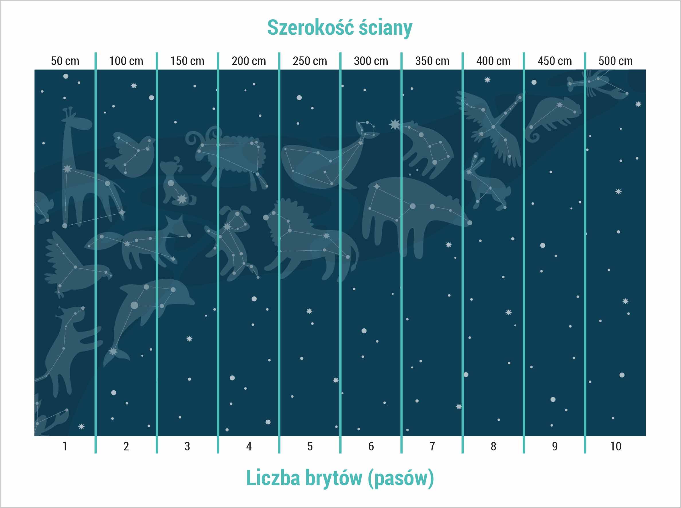Fototapeta "Gwiezdne zoo" prezentuje rysunkowe gwiazdozbiory zwierząt na tle ciemnoniebieskiego nieba.