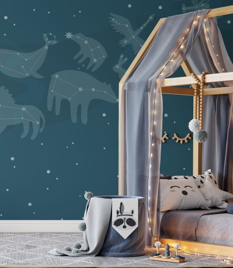 Fototapeta dziecięca z gwiazdozbiorami na ciemnym niebie