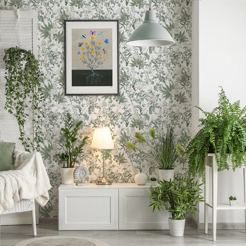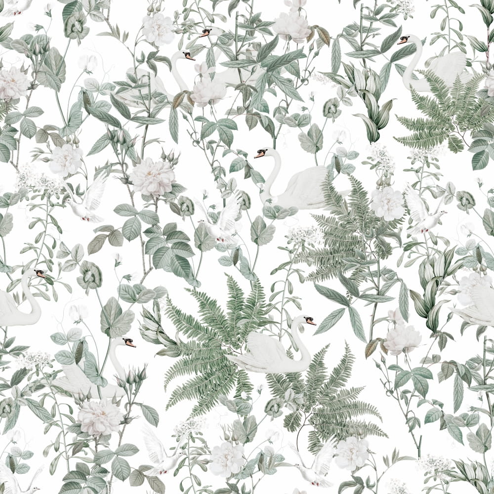 Motywem przewodnim dekoracji jest bujna roślinność w kompozycji z białymi łabędziami i gołębiami na jasnym tle.